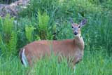 Our largest land-mammal. Summer coat is reddish brown to brown, winter coat is brown to grey. No spots present in adult coat. Large, highly branched antlers in the stag (male).